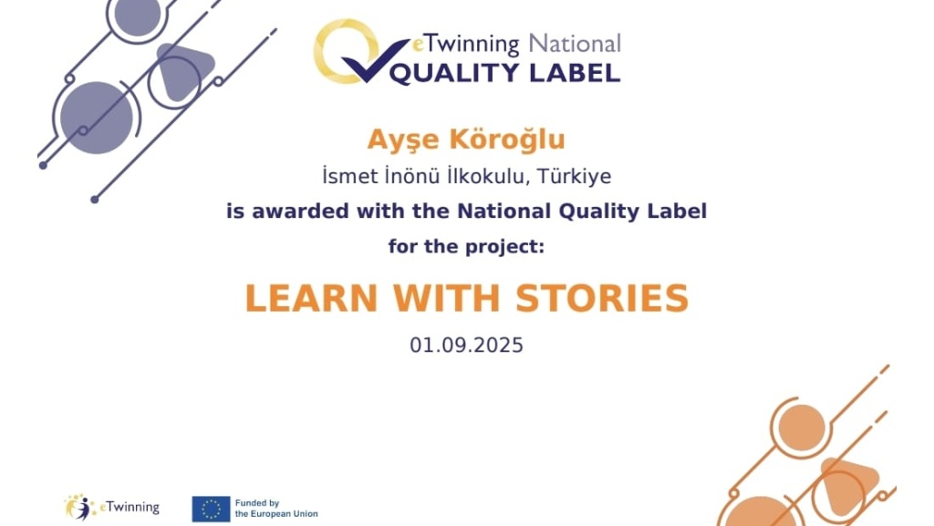 İngilizce öğretmenimiz Ayşe Köroğlu'nun koordinatörlüğünde okulumuzunun da ortakları arasında yer aldığı "Learn With Stories" başlıklı eTwinning projesi Ulusal Kalite Etiketi almıştır. Proje sürecinde emeği geçen sınıf öğretmenimiz Tuğba Koca ve öğrencilerine teşekkür ederiz.